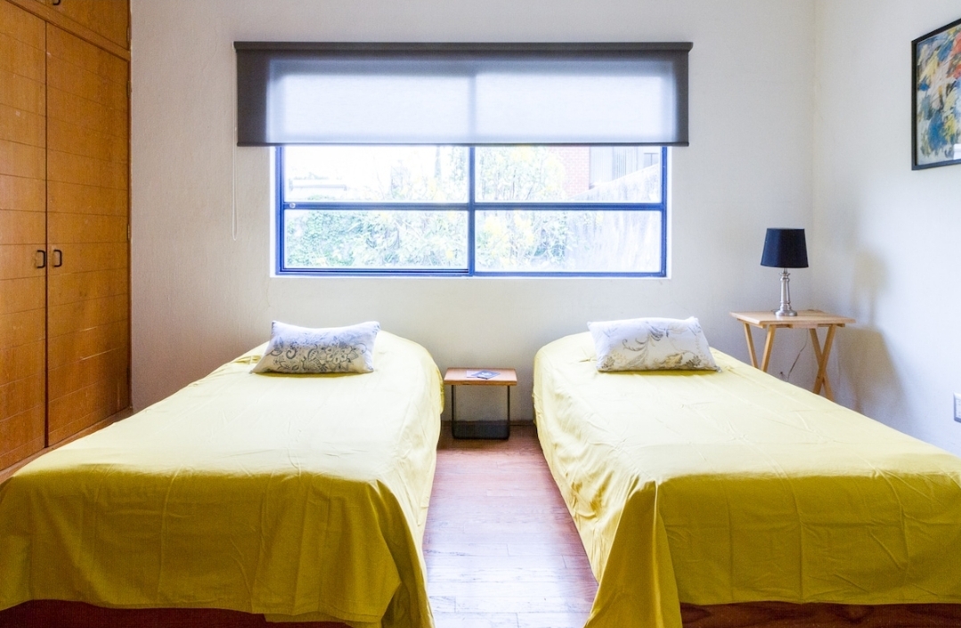 Recámara con dos camas individuales en amplia casa con patio central mexicano ideal para familias, grupos de amigos y amantes de la arquitectura y el diseño mexicano
