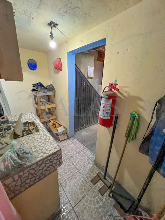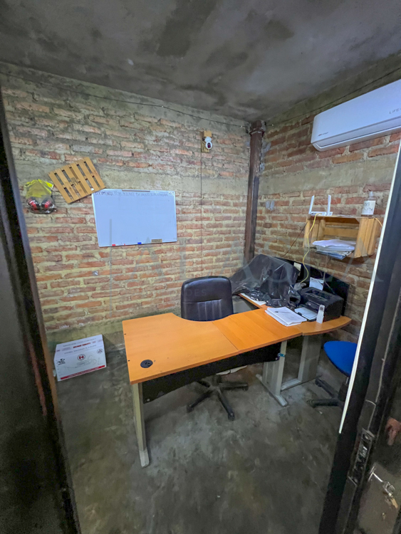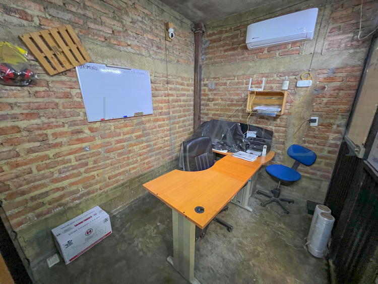 oficina, dos baños en la parte de abajo para hombre y mujer, planta de emergencia en caso de incendio.